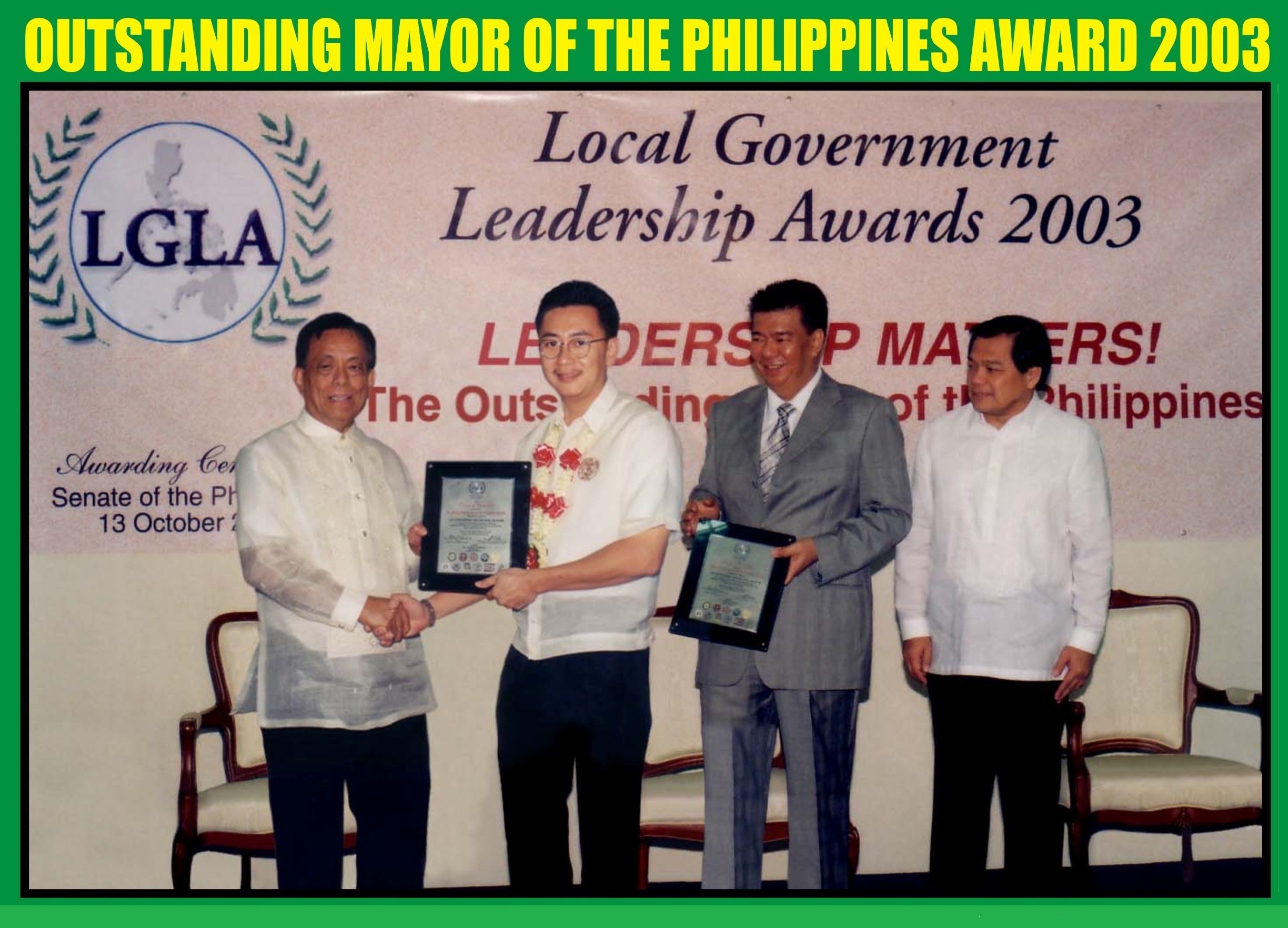 Pagsanjan, Laguna Municipal Mayor Jeorge “E.R” Ejercito Estregan receives from Senator Aquilino Pimentel, JR., Senate President Franklin Drilon and DILG Secretary Jose Lina, Jr. A plaque of recognition after he was conferred the 2003 local Governenment leadership award as one of the Top ten Outstanding Municipality Mayors of the Philippines, in recognition of his Exemplary Leadership Qualities and Significant Contribution to the promotion of Good Local Governance and Community Development, in rites helt last October 13,2003 at the Recto, laurel, Tanada rooms of the Philippines senate, Pasay City.